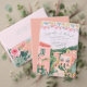 This destination wedding Save the date features painted artwork of a Mexican town scene with papel picado banners on top. All the important wedding details can be personalized. Colors include green, pink, blue, white and coral.