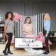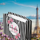 Classic slim black and white stripes as background. With romantic pink roses, and the the Eiffel Tower as decoration. A black and white frame with templates for your party information.