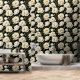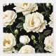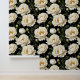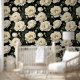 Een mooi naadloos herhalend patroon van muur tot muur gebroken witte peo pioenbloemen met mosterdgouden meeldraden in volle bloei gezet tegen een zwarte achtergrond met kleine groene bladeren en pioenroerknoppen rond de bloesem. Dit gedurfde en elegante op weide geïnspireerde ontwerp heeft een tijdloze en elegante zomer / lente-uitstraling. Transformeer elke kamer in een statig en majestueus meesterwerk met dit ontwerp geschikt voor elke grote ruimte, of het nu een woonkamer, badkamer of slaapkamer is. Ideaal voor landhuizen, Engelse en Franse huisjes, huizen en zakelijke omgevingen.