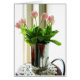 Deze kaarten, t-shirts en andere items zijn versierd met een foto van een boeket roze tulpen in een glanzende metalen werper.