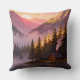 Add a warm and peaceful touch to your home with this stunning throw pillow featuring a pixel art sunset mountain landscape. The design showcases a cozy wooden cabin by the lake, surrounded by pine trees and misty mountains under a glowing sunset sky.