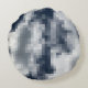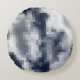Pixelated blauw-wit wolkenontwerp op rond hoofdkussen.
