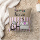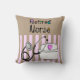 Unieke zuster Retirement Pillow, zuster pet, stethoscoop met roze poka-punten en strepen op een lichtbruine achtergrond. Achterkant van kussen in coördinerende kleuren.