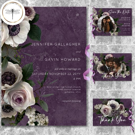 Dit prachtige ontwerp voor huwelijksuitnodigingen is voorzien van een fascinerende spray van bleke lavendel, witte, groene en bleke roze anemonen en rozen, kunstig gerangschikt tegen een luxe donkerpruim paarse achtergrond met een zacht gemarmerd effect. De strakke, moderne witte typografie voegt een vleugje elegantie toe, waardoor deze uitnodiging de perfecte keuze is voor een romantische en verfijnde bruiloft. Creëer door Simply Farmhouse Press.