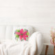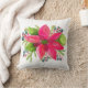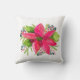 White pillow featuring a brightly colored watercolor poinsettia with sprigs of eucalyptus and evergreen with red berries.