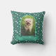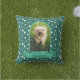 Lijst een verticale foto van uw huisdier in een klassieke boog lijst in blauwgroen met een banner voor zijn of haar naam. Achtergrond is witte polka stippen op blauwgroen.