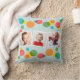 Creëer een kleurrijke souvenir en voeg wat plezier toe aan uw verjaardagsfeestje tegelijkertijd te versieren. Dit werpkussen is klaar om te worden aangepast met drie van uw favoriete foto's. (Vierkante foto's werken het beste.) Je afbeeldingen zijn geplaatst tegen een lichtblauwe achtergrond geaccentueerd met kleurrijke stippen in blauw, geel, groen, rood en sinaasappel. Er is een coördinerend puntpatroon op de keerzijde.