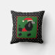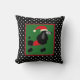 Moderne en feestelijke werpkussens zijn voorzien van zwarte en witte polka stipachtergrond met zwarte pooe in een kersthoed en een zweet in een vierkant met groen midden.