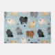Cute Pomeranian dogs in black, gray, cream, chocolate and red coats sit and stand with scattered dog bones and paw prints on a light blue background.