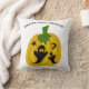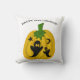 Dit werpkussen is voorzien van oranje pompoenen, zwarte geesten en sterren en manen met de woorden "Happy Halloween" boven het ontwerp.