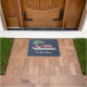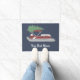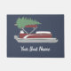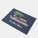 Creëer een aangepast vakantieoord voor je thuis of je boot. Deze gepersonaliseerde doormat heeft een afbeelding van een rode en witte pontoon boot met een groene kerstboom die aan de bovenkant tegen een blauwe achtergrond is vastgebonden. Het is klaar om gepersonaliseerd te worden met de naam van uw boot in witte scriptletters.