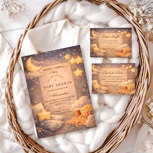 Set the scene for a cozy, cinematic celebration with this movie-themed baby shower design. Inspired by a warm home-theater night, the artwork features glowing string lights, classic popcorn tubs, soft blankets, and a nostalgic film-screen centerpiece that instantly creates a relaxed, intimate atmosphere.