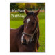 Een fotografisch afbeelding van een bruin paard met een beetje wit op zijn neus, en bridle in zijn mond. Een aangenaam enigszins wazige achtergrond van groen gras, herfstbomen en een korraalhek.