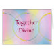 De spirituele bevestiging, Samen goddelijk, wordt getoond op een achtergrond van cirkels en bollen van roze, geel, en blauw. De manier waarop we denken veranderen.