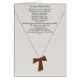 Het gebed van Sint Francis op een crèmebeige getextureerde achtergrond met een eenvoudig houten kruis in een platte keten. Dit simpele gebed en kruis symboliseren armoede, nederigheid en eenvoud, die worden gekenmerkt door St. Francis van Assisi.