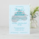 Design features a pale blue background to the image of delicate crocheted baby booties in center. Name of guest-of-honor is displayed in an elegant, ocean blue font. Event is featured below in bold. An elegant flourish borders design.