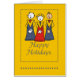 vakantiekaarten met 3 koerierdames, een gele achtergrond en het gezegde Prettige feestdagen. Geweldige kaarten om naar familie en vrienden te sturen tijdens de vakantie.