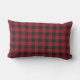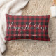 Op maat ontworpen decoratief lumbaal kussen met "HappyHolidays" of uw keuze van tekst in moderne borstelscript / handkalligrafie met gepersonaliseerde familienaam op een feestelijk zwart en rood buffel check / plaid / gingham check patroon. Vakantie/Kerstmis gepersonaliseerde home decor. Landhuis boerderij home decor ideeën.