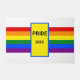 Pride bij het ontwerp van LGBTQ-LGBTQ (Thuisregenboogregatie) in LGBTQ. Ontwerpbeschrijving: de horizontale rode, oranje, gele, groene, blauwe en paarse strepen van de vlag van de pride. Zoals getoond, is de binnenkant van de rechthoek het zelfde geel als de gele streep op de vlag, en de grens van de rechthoek is het zelfde blauwe als de blauwe streep van de vlag. De woorden in de rechthoek zijn in zwarte doopvont. Volledig aanpasbaar. Opmerking: het ontwerp staat in het midden centraal. De strepen gaan horizontaal van rand tot rand, maar niet verticaal en de centrumrechthoek die met tekstcentra over de strepen wordt gevuld en gaat verticaal van rand tot rand niet. Zoals getoond, op de standaard witte achtergrond.