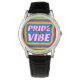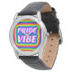 Vier diversiteit en inclusie met dit levendige ontwerp met "PrideVibe" omringd door een spectrum van regenboogkleuren. De stralende tinten contrasteren prachtig tegen de strakke zwarte lederen band, waardoor een gedurfd statement stuk ontstaat dat eenheid, liefde en individualiteit belichaamt. Perfect om het hele jaar door met je Pride te pronken met een stijlvol en kleurrijk horloge.