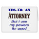 Ja, ik ben advocaat, maar ik gebruik mijn krachten voor goed gezegde. Een grappige jurist slogan voor professionals in wettige hoofdletters in blues en browns. Klik op Aanpassen om jouw naam of bericht toe te voegen.