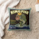 illustratie: kunstreclame in blik voor groentekratenetiketten met een grote koningsvis met een enorme gapende mond die uit het water springt en een kroon als een royalty draagt. Antiek adverteren voor Kingfish California green asparagus. Groen en verpakt door koning en koning, Sacramento, Californië.