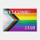 Deze welkome vormgeving is voorzien van een prachtige Progress Pride LGBT-regenboogvlag met een strandfotografie-achtergrond. De regenboogvlag is een symbool van de LGBT-trots en dit model is een geweldige manier om je steun voor de gemeenschap te shows. Aan de ene kant staat "Welkom" en aan de andere kant staat "Dag!". Het wordt ook gepersonaliseerd met uw familienaam of een kort bericht in het centrum. Dit is een geweldig cadeau voor een vriend of familielid die homo, lesbisch, biseksueel, transseksueel, enz. is.