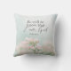 Gooi kussen met inspirerend citaatgeschrift toont een eenvoudige botanische tuin met  roze bloemen en een zacht blauwe achtergrond. Het bevat bijbelvers Psalm 46:10, "Wees stil en weet dat ik God ben."