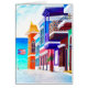 Het schilderen van een straat in San Juan, Puerto Rico met de Puerto Ricaanse vlag, kleurrijke gebouwen en planten.