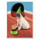 Pug met tong uit groene feestcake en kaarsen met pet op achtergrond