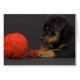rottweiler van 1 , 5 maanden oude puppy speelt met rode garen .