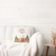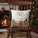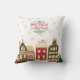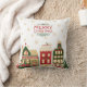 Een feestelijk gooien kussen van een schilderachtig Victoriaans dorpje, zijn charmante huizen gekleed in feestelijke vakantie decor, elk raam uitstralend een warme, uitnodigende gloed met gouden sneeuwvlokken vallen op de achtergrond en de tekst - Vrolijk kerstfeest - aan de bovenkant.