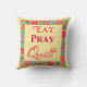 Voeg wat liefde voor quilten toe met dit unieke decoratieve kussen voor degenen die van quilten houden. De woorden "Eat Pray Quilt" zeggen het allemaal voor een quilte die je met dit decoratieve werpkussen kunt shows. Deze woorden in rode tekst en 3 verschillende lettertypen en zijn gecentreerd in een kleurrijke quiltblokkunstrand op een gele achtergrond. De kleuren zijn rood, roze, geel, sinaasappel, turquoise blauw en groen. Deze originele kunst is van stoffen ontwerper Phyllis Dobbs en coördineert met andere producten in deze winkel. De grens omvat favoriete blokken zoals de blokhut, ster, vierkant in een vierkant, en anderen, evenals een appelbloemenblok.