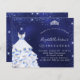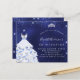 Een moderne, stijlvolle en glamoureuze uitnodiging voor een 15de verjaardag van Quinceañera. Een blauwe achtergrond om middernacht met faux glitter stof, een tiara en een jurk. De blauwe kleur is ongelijk. De naam wordt geschreven met een modern handgeschreven stijlmanuscript met letters. Pas je partijgegevens aan en voeg deze toe.