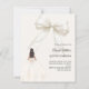 This sophisticated design features a large ivory bow adorned with delicate pearl details, paired with a graceful gown illustration.