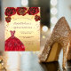 Een moderne, stijlvolle en glamoureuze uitnodiging voor een 15de verjaardag van Quinceañera. Een faux gouden achtergrond met faux goudstof, een jurk en rode rozen, bloemen. De naam wordt geschreven met een modern handgeschreven stijlmanuscript met letters. Pas je partijgegevens aan en voeg deze toe.