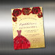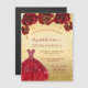 Een moderne, stijlvolle en glamoureuze uitnodigingsmagneet voor een Quinceañera, 15e verjaardagsfeest. Een faux gouden achtergrond met faux goudstof, een jurk en rode rozen, bloemen. De naam wordt geschreven met een modern handgeschreven stijlmanuscript met letters. Pas je partijgegevens aan en voeg deze toe.