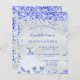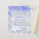 Een faux zilveren achtergrond. Gedemoreerd met royal blue confetti, sparkles. Pas een naam en partijdetails aan en voeg deze toe. De naam wordt geschreven met een handgeschreven stijlmanuscript met letters.