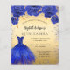 Een moderne, stijlvolle en glamoureuze uitnodiging voor een Quinceañera, 15e verjaardagsfeest. Een faux gouden achtergrond met faux blue sparkles en een royal blue dress en rozen, florals. De naam is geschreven met een modern handschrift. Personaliseer en voeg uw feestdetails toe. 1 vel = 1 uitnodiging afgedrukt rand tot rand.