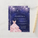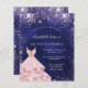 Een trendy en glamoureuze uitnodiging voor een Quinceañera, 15de verjaardag. Een blauw marineschaafje met roze faux glitter stof en een jurk. De blauwe kleur is ongelijk. De naam wordt geschreven met een modern handgeschreven stijlmanuscript met letters. Pas je partijgegevens aan en voeg deze toe.