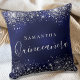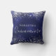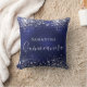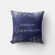 Een kussen voor een Quinceañera, 15-jarige meisjeskamer. Een blauwe achtergrond voor de marine met faux zilverglitter stof. De blauwe kleur is ongelijk. De tekst: Quinceañera wordt in wit geschreven met een groot modern, met de hand geschreven stijlscript. Pas een naam aan en voeg deze toe.