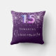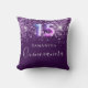 Een kussen voor een Quinceañera, 15e jaar oude meisjeskamer. Een diep paarse achtergrond met roze faux glitter druppels, vlekken. De tekst: Quinceañera is geschreven in het paarse schrift met een groot handschrift. Personaliseren en een naam toevoegen. Nummer 15 is geschreven met een ballon stijl lettertype.