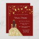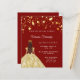 Een rode achtergrond. Versierd met gouden sterren en een meisje met een tiara en een gouden jurk. Personaliseer en voeg een naam en details toe. 1 vel = 1 uitnodiging bedrukt rand tot rand.