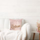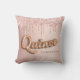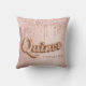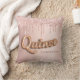 Een kussen voor een Quinceañera, 15e jaar oude meisjeskamer. Een faux roos gouden achtergrond met een elegante faux roos gouden glitter druppels, lak druppelen look. De tekst: Quince is geschreven met een ballonstijl lettertype. Een naam personaliseren en toevoegen.