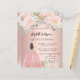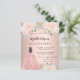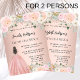 Een moderne, stijlvolle en glamoureuze uitnodiging voor 2 Quinceañeras, 15e verjaardag partijen. Een rozen gouden achtergrond versierd met roze bloemetjes, bloemen en een meisje met een baljurk. De namen zijn geschreven met een modern handgeschreven stijlschrift. Personaliseer en voeg uw partijgegevens toe. Een naam aan elke kant. 1 vel = 1 uitnodiging bedrukt rand tot rand.