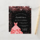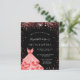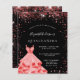 Een moderne, stijlvolle en glamoureuze uitnodiging voor een 15de verjaardag van Quinceañera. Een zwarte achtergrond met rood faux glitter stof en een jurk. De naam wordt geschreven met een modern handgeschreven stijlmanuscript met letters. Pas je partijgegevens aan en voeg deze toe.