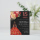 Een moderne, stijlvolle en glamoureuze uitnodiging voor een Quinceañera, 15e verjaardagsfeest. Een zwarte achtergrond, een meisje met een rood en gouden jurk en rode, roze en gouden rozen, bloemen. De naam is geschreven met een modern handgeschreven stijlschrift. Personaliseer en voeg uw partijgegevens toe. 1 vel = 1 uitnodiging bedrukt rand tot rand.