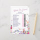 Maak je klaar voor het ultieme gisspel, "Raad eens wie, bruid of bruidegom?" Test je kennis van het paar als gasten proberen te bepalen wie meer kans heeft om bepaalde dingen te doen, de bruid of de bruidegom. Met elegante, moderne lente-zomer bloemenillustraties in rode, paarse, roze en terracotta tinten die het vel versieren, voegt dit spel een stijlvolle touch toe aan uw feest. Laat de vriendschappelijke competitie beginnen!