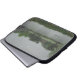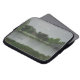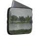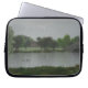 Deze laptoptas heeft een origineel kunstwerk van een grijze en regenachtige lakeside scène, gemaakt in Vue d'Esprit door kunstenaar Jayne Wilson. Een eendenfamilie maakt haar weg door het meer als regendruppels herfst. Een steenbrug leidt tot een huisje aan de verre kant van het meer.
