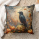 Dit herfst gooi kussen vangt een humeurige bos scène met een raaf gelegen tussen pompoenen onder een schemering hemel. Ideaal voor gotische of donkere cottagecore herfst decor.